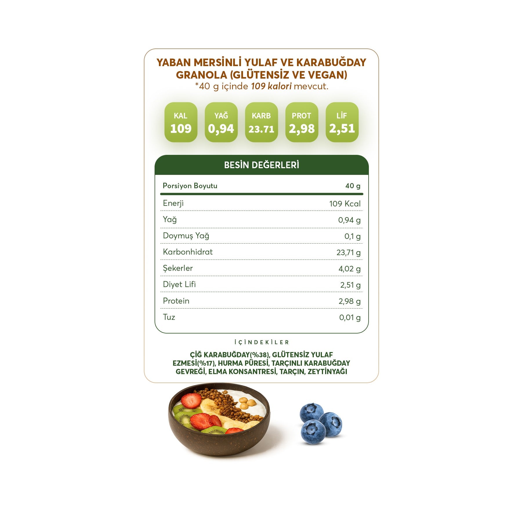 Glutenfreies und veganes Granola mit Hafer, Buchweizen und Blaubeeren – 200 g.