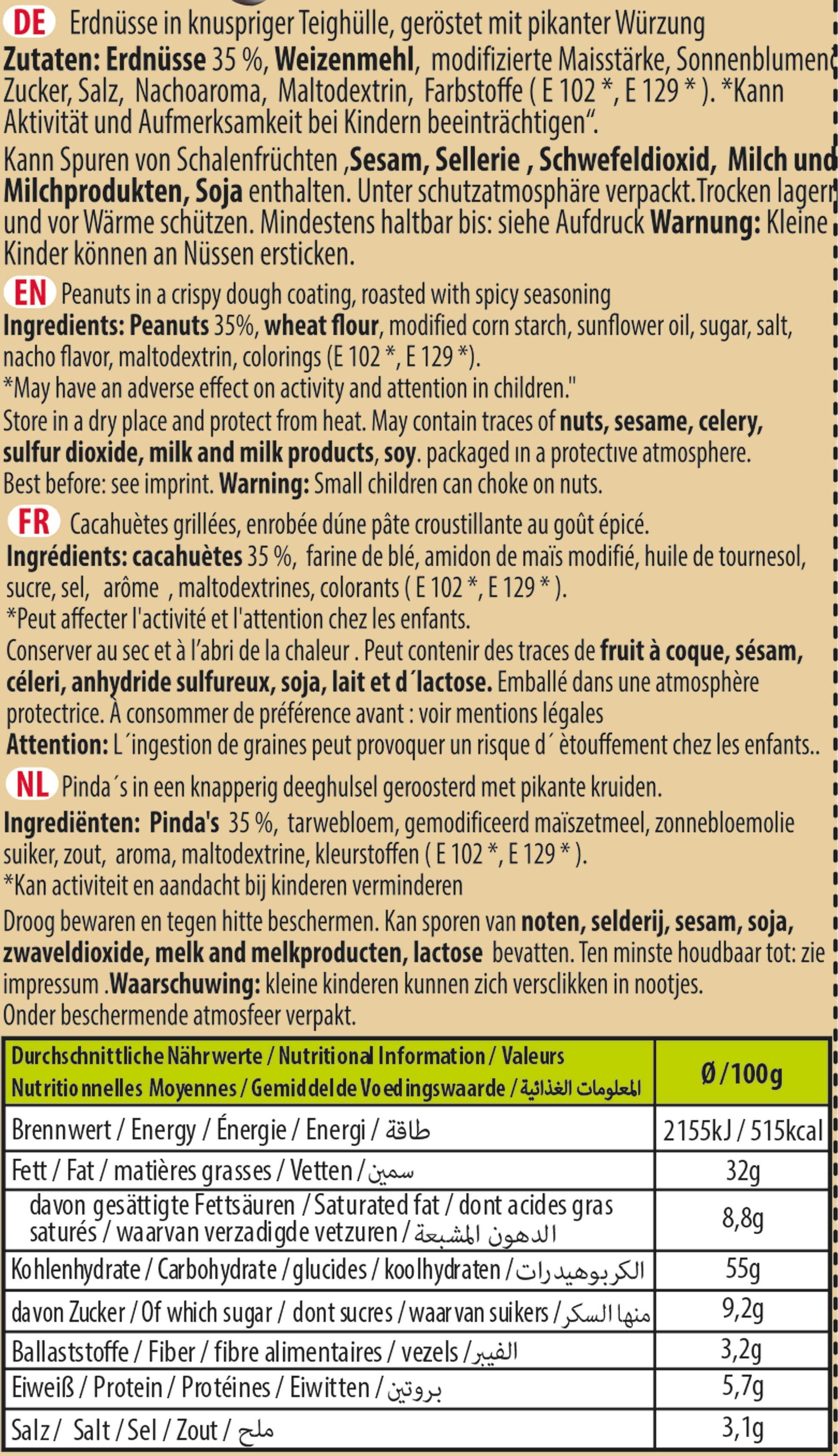 Die Mr. Cloud Erdnusskerne Nacho sind der würzige Knabberspaß für echte Snack-Liebhaber. Knackige Erdnüsse, umhüllt von einer goldbraun gerösteten, knusprigen Teighülle – verfeinert mit einer pikanten Nacho-Würzung.